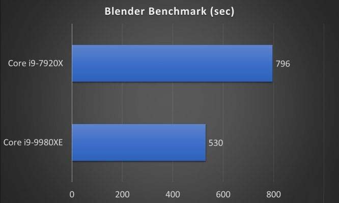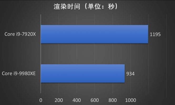 5分鐘的視頻渲染大約花費了酷睿i9-9980XE大約15分34秒,而酷睿i9-7920X渲染相同視頻花費的時間為19分55秒。渲染越長視頻,酷睿i9-9980XE能夠節省的時間越多。