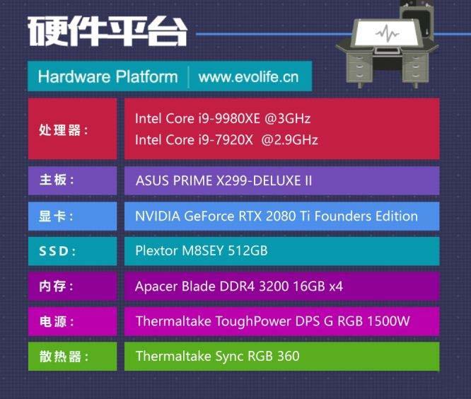 這里我們特意給酷睿i9-9980XE配置了一套符合需求的平臺,包括一塊ASUS PRIME X299-DELUXE II主板,NVIDIA GeForce RTX 2080 Ti Founders Edition顯卡,內存也選用了單條16GB的宇瞻Blade DDR4 3200,組成64GB容量4通道,并為其配上TT一體水冷和1500W RGB電源。