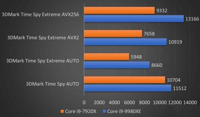 回歸重點,在3DMark Time Spy Extreme的CPU測試部分中已經加入了對AVX2、AVX512支持。可以看到,酷睿i9-9980XE在AVX2和AVX256這樣的高負載下,優勢相當明顯。
