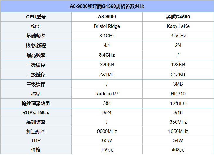 還是老規矩,我們先來了解一下A8-9600和奔騰G4560對比基本規格參數情況,初步了解一下這兩款處理器之間的差異。