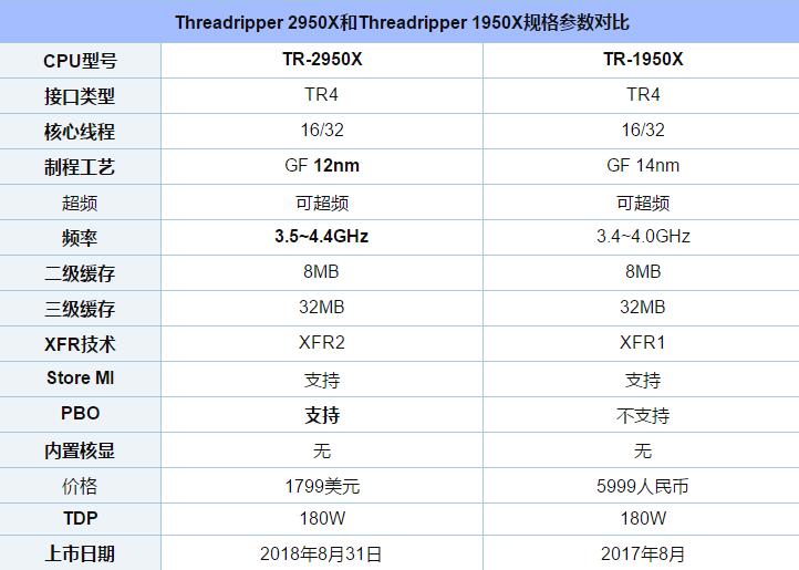 通過規格參數對比不難看出,第二代線程撕裂者2950X相比第一代線程撕裂者1950X提升了制造工藝,提高了頻率,對應的自然是性能方面的提升,而功耗保持不變。