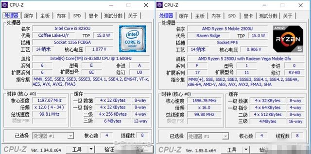 從對比中可以看出,主頻方面,Ryzen 5 2500U處理器要比i5-8250U高出0.4GHz,但i5-8250U要在三級緩存方面占據微小優勢。