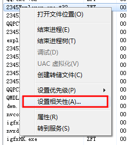 4、找到你要設置的應用程序的進程,右擊,選擇設置相關性選項