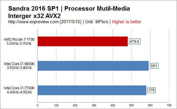 Sandra 2016 SP1處理器多媒體整數(shù)測試,使用AVX2指令集,Ryzen 7 1700明顯處于下風(fēng),兩個Core i7處理器表現(xiàn)接近。