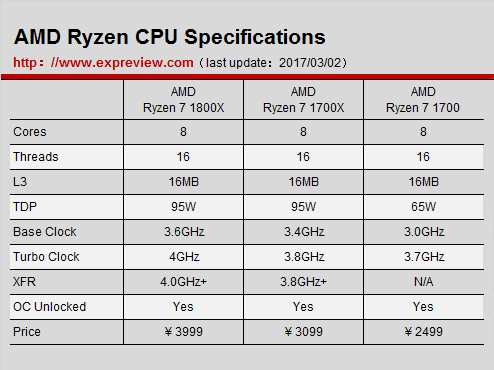 首批上市的銳龍 AMD Ryzen 7處理器是三款八核,具體規(guī)格如上表所示,主要還算頻率上的區(qū)別,然而這三款處理器都是不鎖倍頻的,有經(jīng)驗的老玩家應(yīng)該一眼就看得出銳龍 AMD Ryzen 7 1700的性價比與可玩性是最高的,對于一顆不鎖頻的CPU來說默認(rèn)頻率就是浮云,打算買銳龍 AMD Ryzen 7 1700回來超到4GHz來用的人絕對不在少數(shù),現(xiàn)在我們就要測試一下這款超高性價比的八核處理器。