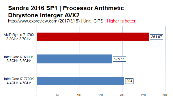 Sandra 2016 SP1算數(shù)處理器Dhrystone整數(shù)性能,使用AVX2指令集,八核的Ryzen 7 1700占盡優(yōu)勢,不過有趣的是只有四核的Core i7-7700K利用高頻以及更先進的架構(gòu)優(yōu)勢超過了六核的Core i7-6800K。
