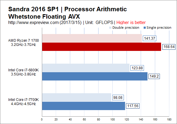 Sandra 2016 SP1算數(shù)處理器Whetstone單精度與雙性能浮點性能,使用AVX指令集,這個測試的結(jié)果就是完全看核心數(shù)量多少了,Ryzen 7 1700完全勝利。