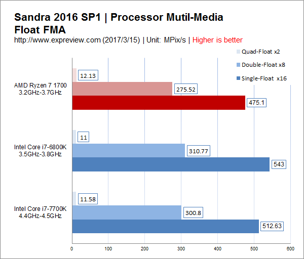 Sandra 2016 SP1處理器多媒體單精度、雙精度、四精度浮點測試,使用FMA指令集,Ryzen 7 1700在四精度浮點運算上占一些優(yōu)勢,單精度與雙精度都處于下風(fēng)。