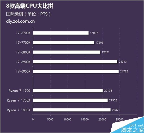 CPU運算及應用部分,Intel旗艦級的產品憑借十核二十線程的強大規格遙遙領先(國際象棋成績為16線程狀態),不過該產品的價格已經是銳龍 AMD Ryzen 7 1800X的三倍以上。在其余的產品中,Intel和AMD各有勝負,如果綜合價格因素來看,依舊是Ryzen平臺更具優勢。