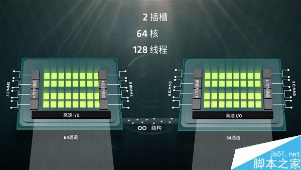 雙路并行時,其中一半用于兩個CPU之間互通,并利用Infinity Fabric結構確保互連一致性,對外再各自提供64個通道。