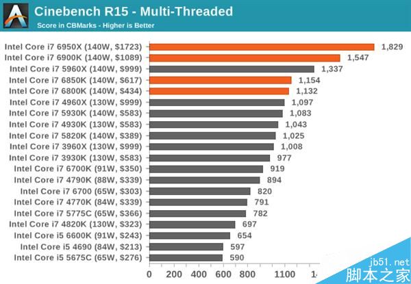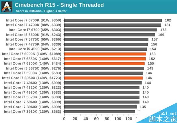 性能方面,以CineBench R15來看,單線程性能中規中矩,但多線程絕對無敵,i7-6950X得分已經突破1800,i7-6900K也大幅度領先i7-5960X 20%之多,i7-6850K/6800K也都超越了i7-4960X。
