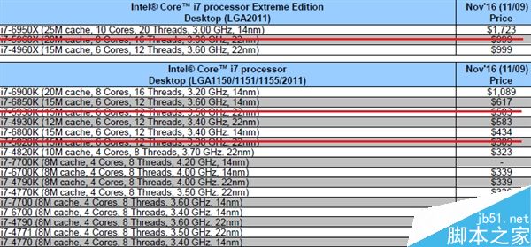 遭到除名的是Core i7-5960X, Core i7-5930K,Core i7-5820K處理器,從Intel官方信息來看,它們發布于2014年Q3,可謂立下赫赫戰功。