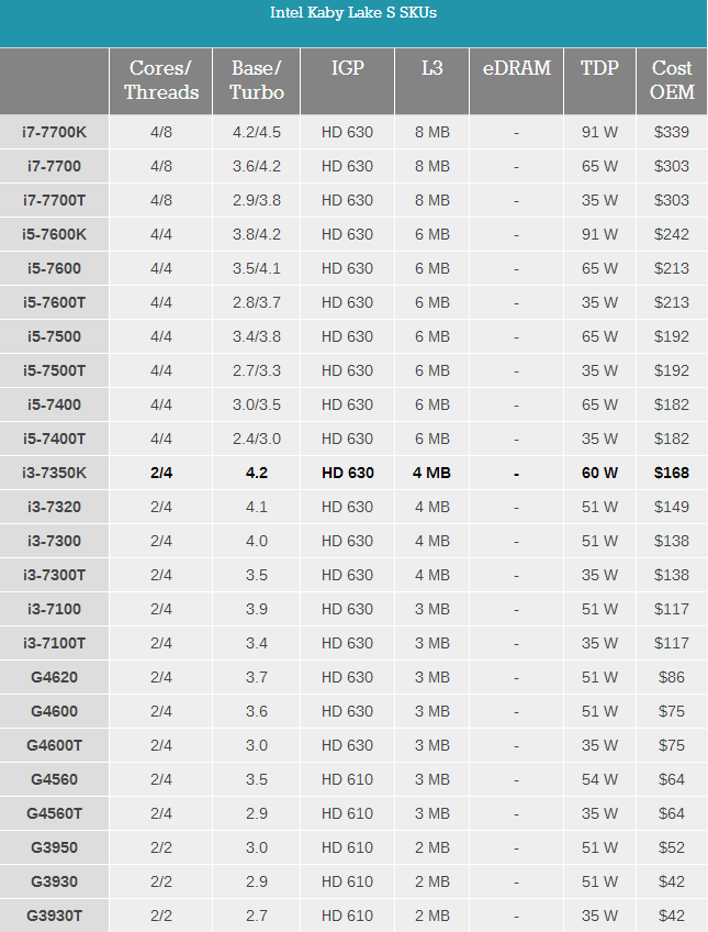 i3-7350K和所有的i3一樣仍為雙核心四線程、4MB三級緩存,預設主頻為4.2GHz,核芯顯卡HD 630,熱設計功耗60W,略高于其他標準版的51W,而批發價格為168美元,美國亞馬遜目前實際售價157美元。