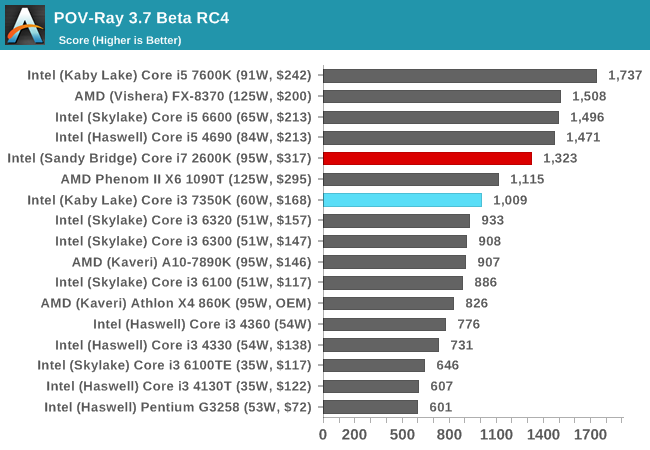 POV-Ray對于多核心、高主頻都支持不錯,i3-7350K只落后i7-2600K不到30%。
