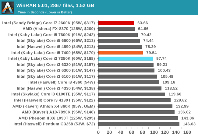 WinRAR多線程優化到位,雙核的i3-7350K就很吃虧了。