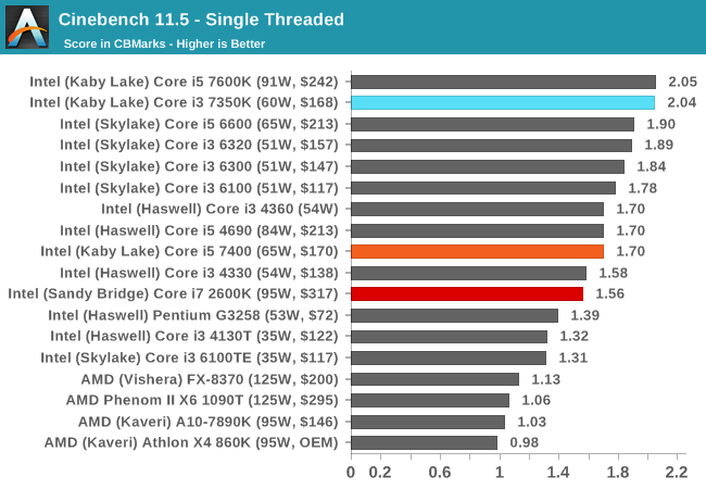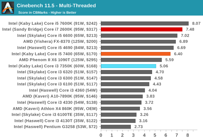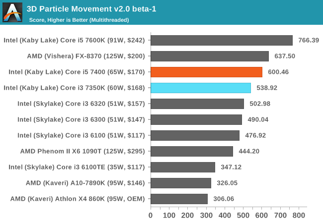 這個單線程為主的模擬測試中,i3-7350K憑借高主頻超過了i5-7400、i7-2600K。
