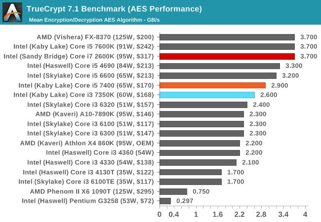 AES加密里,i3-7350K也是落后i5-7400一程。