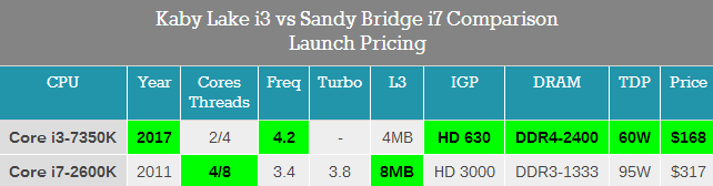 AnandTech近日就對這顆獨特的i3進行了詳盡的測試,并特意拿來當年Sandy Bridge家族的i7-2600K進行了對比——那些說i7-2600K超級就能再戰N年的一定要看好了!