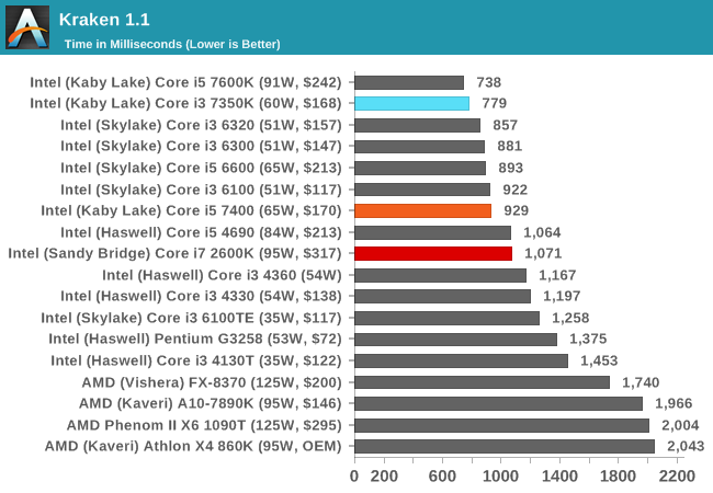 Mozilla Kraken對高主頻優化到位,i3-7350K大勝,直逼i5-7600K!