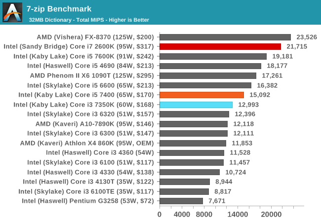 7-zip測試中,核心偏少的i3-7350K依然吃虧,不過和i5-7400也相差不大。