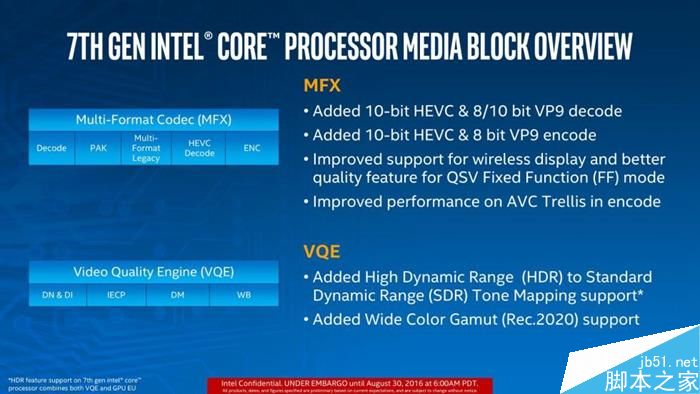 目前確切得知升級(jí)部分是Kaby Lake處理器使用了更強(qiáng)大的Multi-format Codec(MFX,多格式媒體編解碼器硬件模塊),支持10bit HEVC、8/10bit VP9視頻格式的硬件解碼,10bit HEVC、8bit VP9視頻格式的硬件編碼碼;增加了intel無(wú)線高清顯示技術(shù)支持,提高了AVC編碼效率;對(duì)VQE引擎增加支持HDR和SDR,支持更Rec.2020更寬廣的色域,使得輸出視頻畫面色彩具可塑性。