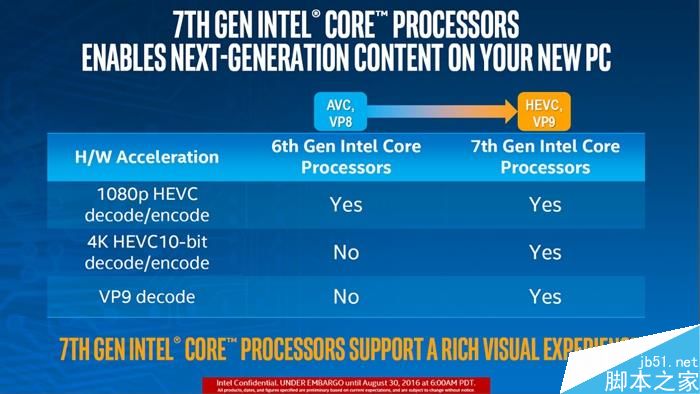 此前的Skylake處理器gen9 GPU架構(gòu)對(duì)不同視頻格式編解碼支持非常不錯(cuò)了,Kaby Lake處理器進(jìn)一步加強(qiáng)了解碼支持。