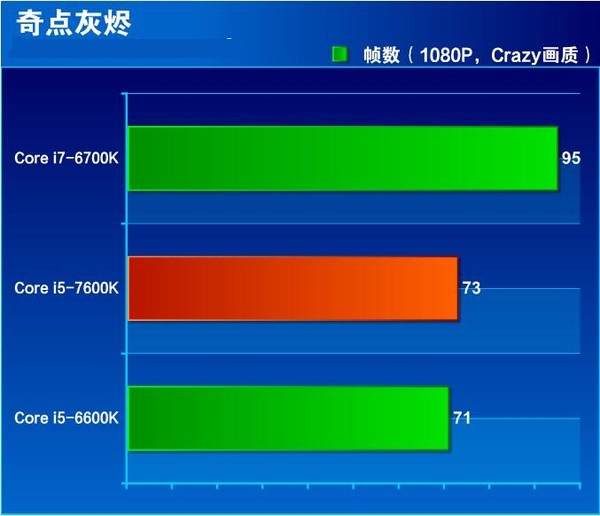 游戲測試算是比較意外的部分,得益于高頻的緣故(4核能同時睿頻至4.0GHz)和大部分的測試游戲對多線程不感冒等原因,Core i5-7600K比i5-6600K的游戲表現占優,且非常接近i7-6700K(4核也是同時只能睿頻至4.0GHz),只有在奇點灰燼上CPU多線程的優勢才明顯體現出來。
