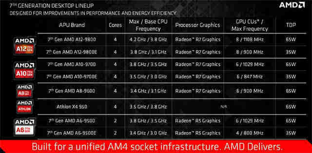 第七代APU一共包括有8款型號,除了新增的A12之外,還有我們熟悉的A10、A8、A6和無GPU的Athlon x4四個系列,TDP有65W和35W兩種。