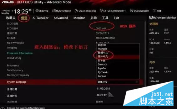 (一)進(jìn)入BIOS 界面!先修改語言、查看BIOS 版本
