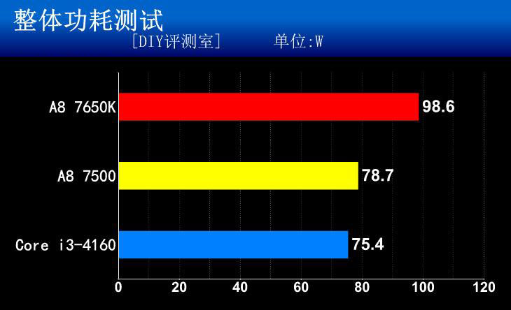 在整體功耗測試中,我們可以看到A8-7500相對于A8-7650K有了很明顯的優(yōu)化,已經(jīng)于Core i3-4160不相上下。而它的性能卻更強,同時價格更低。