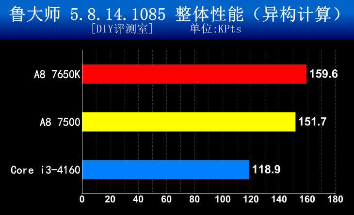 由于A8-7500的獨顯核心Radeon R7性能要遠強于HD Graphics,在異構(gòu)計算測試中,它的表現(xiàn)要遠遠超過Core i3,整體性能領(lǐng)先達到了30%以上。