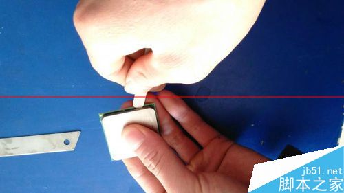 2、這一步用刀劃的時候一定要 小心耐心,不要劃傷了cpu上蓋和下面的部分,不要怕沒地方劃,cpu上面和下面之間有一層 膠 質,有大概不到1mm左右的樣子吧,能容納下刀鋒的。四面全 部 都小心劃開尤其小心劃四角的時候,刀很容易劃傷手的。劃進大概1-1.5mm。 接下來