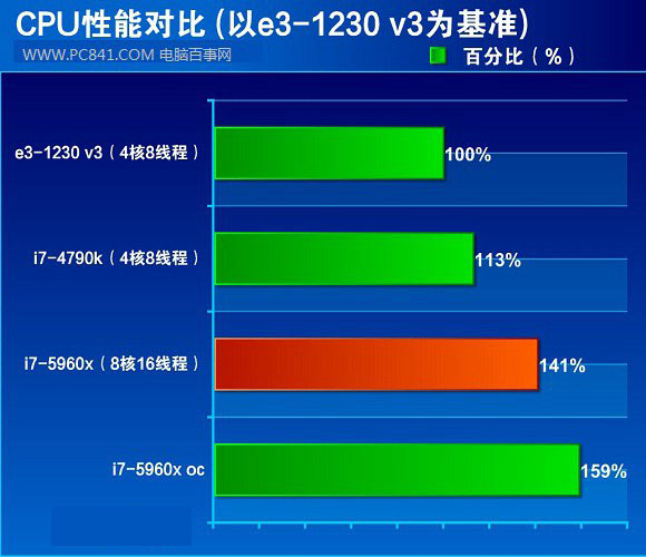評測的最終結果是,i7-5960x處理器在主頻3GHz的性能要比3.3GHz的E3-1230 v3整體性能提高41%,比4GHz的i7-4790k高28%,性能提升非常明顯,不過性能大幅提升的同時,價格也顯得非常昂貴,其售價在7999元左右,是目前售價最高的Intel桌面CPU。