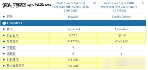 從圖中我們能夠發(fā)現(xiàn)i5-4690K還是例行的100MHz升級(jí),而TDP功耗也是增加4W。相比來(lái)說(shuō)i7-4790K帶來(lái)的提升就比較大了,較于4770K來(lái)說(shuō),有了足足0.5GHz的大幅提升,而TDP功耗的代價(jià)還是僅僅增加4W。