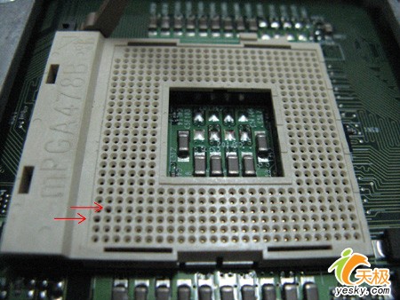 同時478 CPU座上的兩個針孔也非常明顯的發黑變大,內部的金屬簧片已經看不到金屬光澤,如圖二所示。