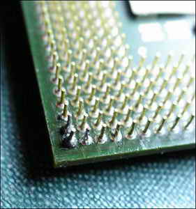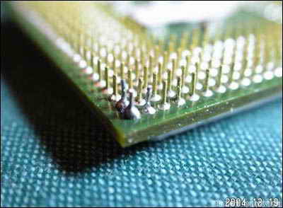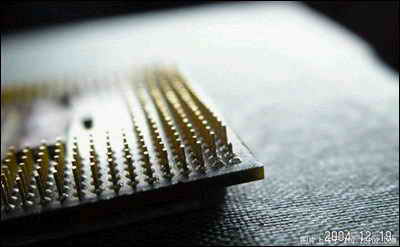 就這樣一塊破碎的“芯”被送到我家。這是一顆Celron 1.7GHz,已經第二塊了,感覺便宜貨就是受人欺負。斷針的位置位于右上角,看起來像是被菜鳥強插的結果-_-!!。(小編自己就如法炮制的搞壞了一塊P4 3.2GHz +_+)