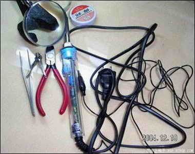 修理前工具要準備好,都是很常見的家用裝備:放大鏡、電烙鐵、鑷子、指甲剪、雙面膠紙、松香和焊錫絲、酒精。