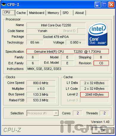 先來看看T2250的參數。從CPU-Z截圖可以看到,T2250的核心代號為Yonah,采用65納米工藝制造,步進為C0。T2250支持的指令集為MMX、SSE、SSE2、SSE3,并不支持Intel EM64T技術。T2250的前端總線為533MHz,打開EIST節能技術支持后,空閑狀態是核心頻率自動降為800MHz。此外在這里還可以看到T2250的一級緩存容量為每個核心64KB,兩個核心共享2MB二級緩存。