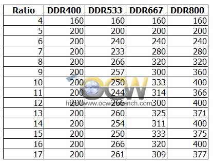 OCW網站經過實踐后得出的倍頻(第一列)與BIOS設置與實際內存頻率速查表(適用于超頻前)