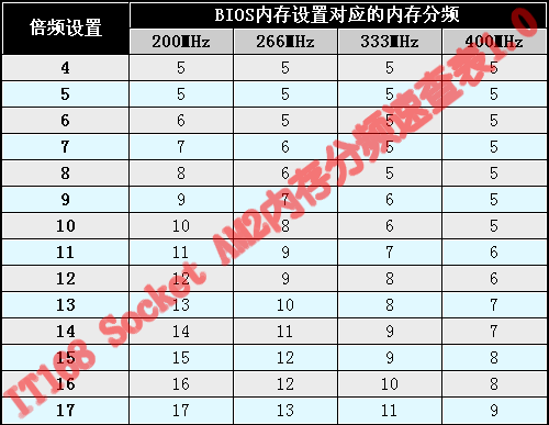超頻的時候,只需要根據倍頻設置和BIOS內存設置從上表查得內存分頻,用實際CPU頻率÷內存分頻,就知道內存實際運行頻率了。祝各位買了Socket AM2的朋友都超出好成績!如果發現此表與實踐不符,請花一點點時間在文章后面的評論中反映,我們會作進一步完善進行修改升級。