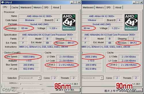 六、用CPU-Z軟件,識(shí)別到底是65NM,還是90NM。這是從網(wǎng)上引用的一張圖,注意看紅線內(nèi)的區(qū)別。