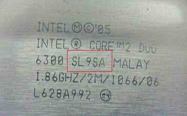 上述這張圖是一顆Core 2處理器表面的文字,第三行中,第二個字段“SL9SA”就是S-Spec號。由于S-Spec號都是以“SL”開頭,也被稱作SL號。SL號是識別處理器的重要依據,每一個SL號只對應某一特定頻率,緩存,外頻和步進的處理器。所以S-Spec號對處理器的分類是最精細的。處理器的任何一個參數發生變化都會引起SL號的變化。比如,都是E6300處理器,也會因為步進的不同而有不同的S-Spec號這就是以S-Spec號來識別步進的依據。