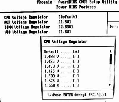 在BIOS中可以設置和調節CPU的核心電壓(如圖7)。正常的情況下可以選擇Default(默認)狀態。如果CPU超頻后系統不穩定,就可以給CPU核心加電壓。但是加電壓的副作用很大,首先CPU發熱量會增大,其次電壓加得過高很容易燒毀CPU,所以加電壓時一定要慎重,一般以0.025V、0.05V或者0.1V步進向上加就可以了。