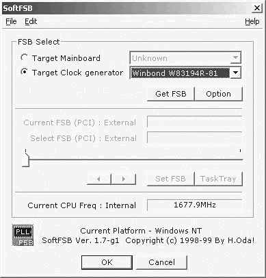 SoftFSB是一款比較通用的軟件(圖8),它可以支持幾十種時鐘發生器。只要按主板上采用的時鐘發生器型號進行選擇后,點擊GET FSB獲得時鐘發生器的控制權,之后就可以通過頻率拉桿來進行超頻的設定了,選定之后按下保存就可以讓CPU按新設定的頻率開始工作了。不過軟件超頻的缺點就是當你設定的頻率讓CPU無法承受的時候,在你點擊保存的那一剎那導致死機或系統崩潰。