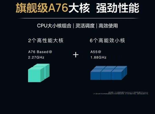麒麟810采用旗艦級A76大核,它由2個(gè)高性能大核(Cortex A76)+6個(gè)高能效小核組合(Cortex A55),CPU主頻2.27GHz,GPU為Mali-G52。