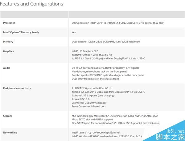 和之前一樣,新NUC依然搭載是七代酷睿家族中的超低電壓版本U系列。其中,i3版本搭載的是Core i3-7100U(雙核2.1GHz,15W TDP),i5版本搭載的是Core i5-7260U(2.2GHz,可加速到3.4GHz,15W TDP),i7版本搭載的是Core i7-7567U(3.5GHz,可加速度到4.0GHz,28W TDP)。