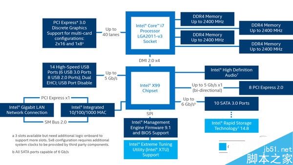 作為旗艦級CPU安家的芯片組,X99平臺自然有很多讓我們側目的地方。例如主流平臺無法超越的40條PCIe 3.0通道、唯獨X99平臺一家的四顯卡交火或者SLI、四通道DDR4內存、雷電接口等等發燒級配置。