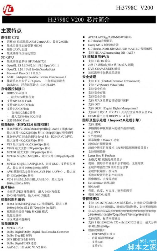 海思Hi3798CV200解碼芯片為2016年杜比實驗室與海思聯合推出一款超高清藍光解碼芯片,基于64位ARM Cortex A53架構,運算速率達到15000DMIPS,穩定性夠強,GPU配置Mali-T720,支持OpenGL ES3.1/2.0/1.1/1.0 OpenVG1.1、EGL技術以及ImprexTM2.0圖像質量引擎,內置硬件解碼器HiVXE2.0視頻引擎,支持2160p60 HEVC和VP9解碼,1080p PIP和轉碼能力,提供靈活的視頻分享和播放服務,由于HiVXE2.0解碼引擎采用2倍的解碼流水線單元,高清動態畫面流暢播放無壓力。