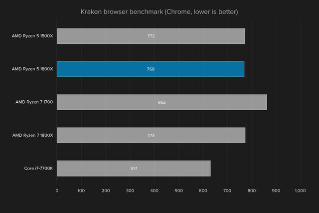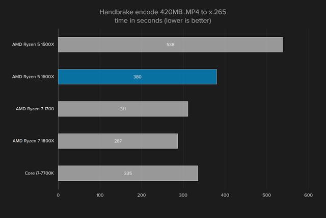 上面提到的兩個優(yōu)勢將1600X的多核跑分提到了與Ryzen 7 1700相當?shù)乃剑谄渌魏螠y試中也同樣遙遙領先于1500X,這種差距還是相當可觀的。在視頻編碼耗時測試中它比1500X要快了35%左右。