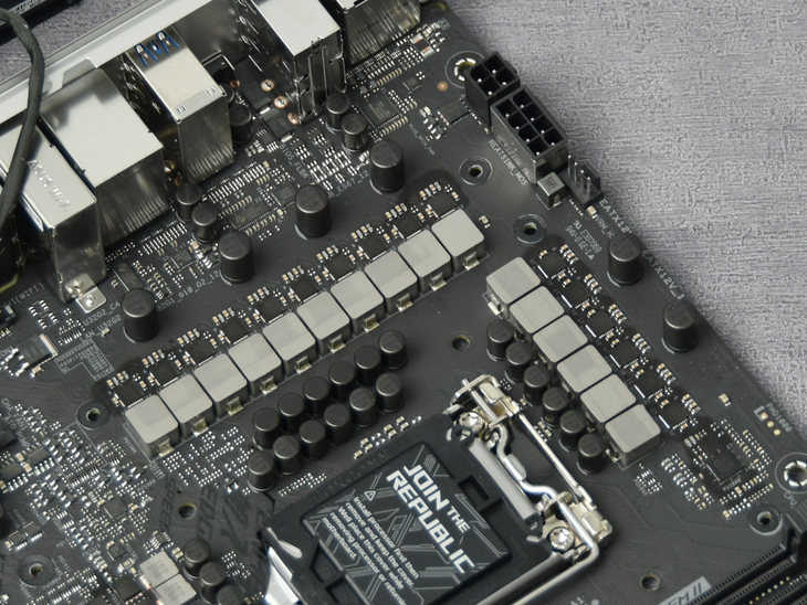 這款主板采用了豪華的16相CPU供電設計,對于DIY硬件玩家們來說很是養眼。CPU供電接口為8+6pin,其中8pin接口采用了金屬加固設計。